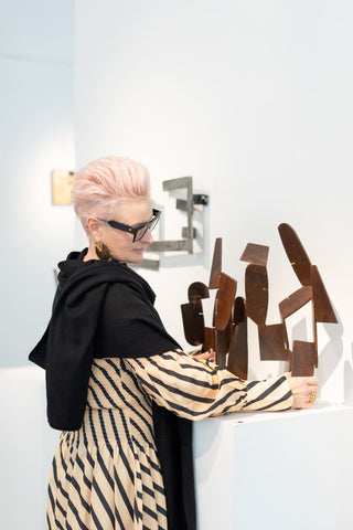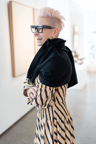 Like the art I curate, I'm drawn to texture. I'm a deeply tactile person, so a Kasmiri cashmere wrap is pure joy, whether I'm at the gallery or out to dinner. I wear a lot of black, so I find myself returning to my black travel wrap again and again. It's warm, effortlessly comfortable, and there's something about putting it on that just makes you feel wonderful. It's also one of those rare pieces that travels beautifully, the kind of thing you reach for on a long-haul flight and somehow still look put-together when you land.